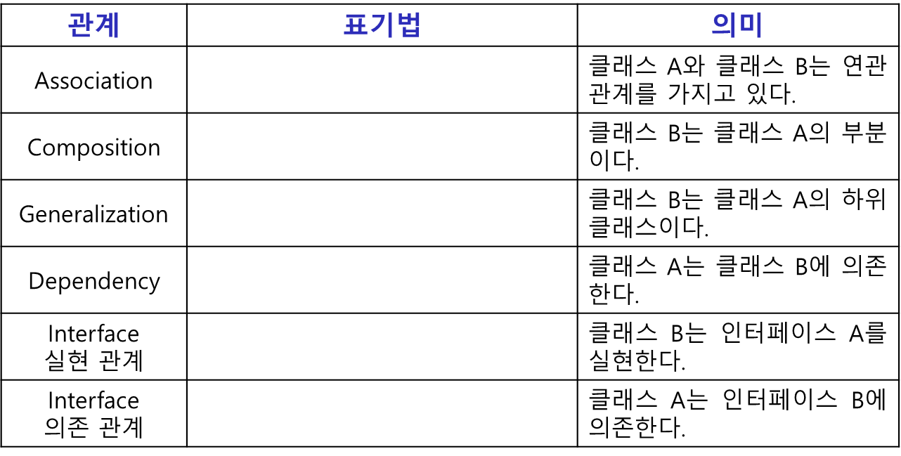 클래스 간의 관계는(연관, 집합, 일반화, 의존)