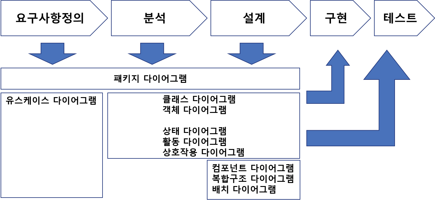 - 구현 및 테스트: 앞 단계에서 작성된 모델을 바탕으로 세부적 활동 수행