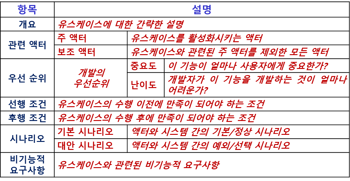 유스케이스 명세서는 유스케이스 모델에 기술된 개별 유스케이스에 대한 구체적이고 상세한 기능을 정의한 문서이다. 유스케이스의 명세서를 구성하는 주요 항목은 아래와 같다.