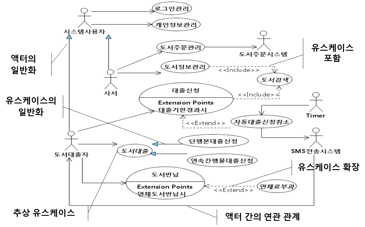 - 액터와 유스케이스의 관계: 특정기능을 위하여 어떤 액터들이 상호작용을 하는지 표현