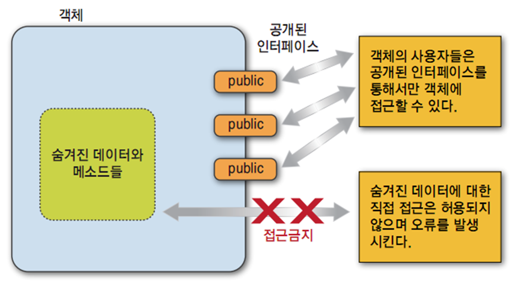 Information Hiding은 객체를 하나의 black box로 취급하여 일부 정보는 은폐하고 일부는 공개하는 것을 의미한다. 아래 그림은 객체와 사용자간의 정보 공유의 차이점을 보여준다.